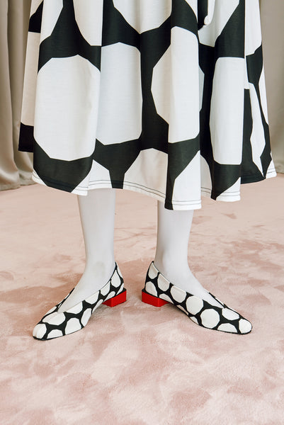 Handmade short heel pumps made of our signature dot print